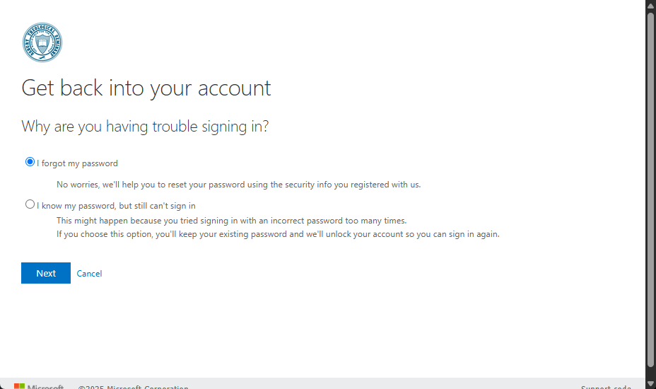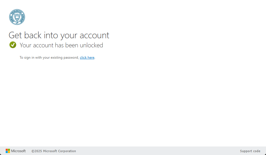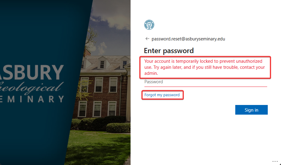 This Self Service Password Reset (SSPR) feature is specifically for your Asbury Seminary Microsoft account and allows you to reset your own password if you forgot it, or to unlock your account for Microsoft enabled logins (including MyATS, Outlook, Teams, and other Microsoft365 services).