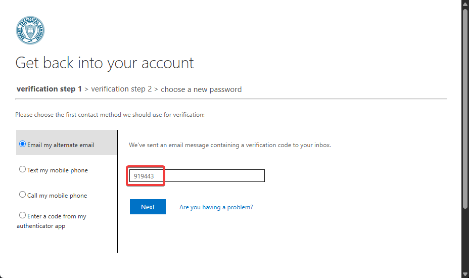 You will now be able to choose the first of 2 required password reset verification methods to receive a code; select your preferred method from the list, and enter the resulting 6 digit code into the field; repeat this process for the second password reset verification method.